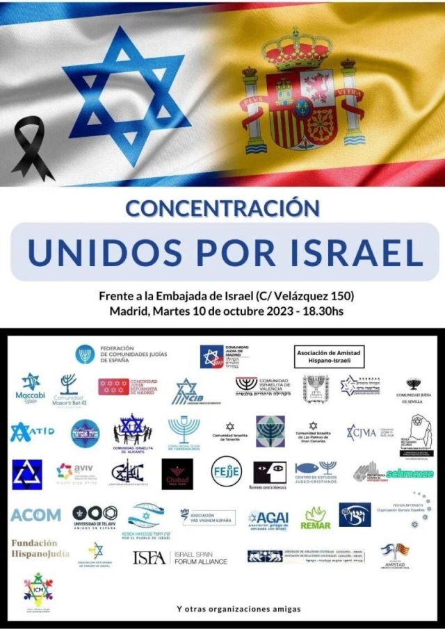 ACTOS EN DIRECTO – Radio Sefarad ha acudido a esta concentración de apoyo a Israel convocada por diversas organizaciones israelíes y judías -entre ellas la Federación de Comunidades Judías de España, FCJE- que busca mostrar respaldo al pueblo de Israel que vive uno de los peores momentos de su historia tras el ataque del grupo terrorista Hamas. Con la presencia de la embajadora de Israel en España, Rodica Radian Gordon, Isaac Benzaquén (presidente de la FCJE) y Estrella Bengio (presidenta de la Comunidad Judía de Madrid), que leyó el comunicado. En este acto cientos de personas se han unido bajo el lema de la unidad y la paz al pie de la embajada israelí en nuestro país. Unidos por Israel. Am Israel Jai