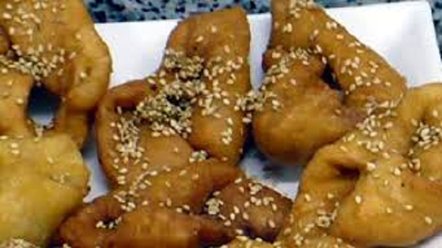200 grs de harina tamizada, 2 huevos, 2 cucharadas soperas de raki o anís, 3 cucharadas de aceite de oliva virgen con la piel de una naranja o un limón. Miel de dátil o de abeja rebajada con zumo de naranja o un almibar de azucar moreno para rociar sobre las hojuelas. Ajonjolí (sésamo) a elección
