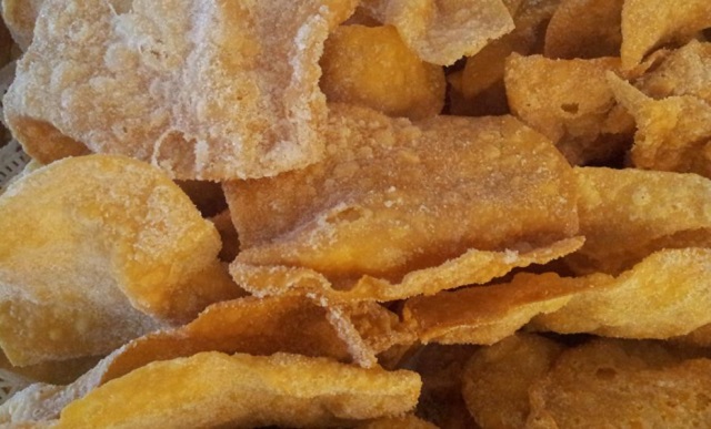 3 cucharadas soperas del licor que se prefiera (brandy, anís, whisky), 3 huevos, 300 grs de harina de repostería. Aceite de oliva (o de semillas) para freír. Peladura de una naranja, limón u hojas de cítricos (para aromatizar el aceite). Miel, jarabe (agua, naranja o limón y azúcar) o azúcar. Granulado frutos secos o sésamo para decorar.