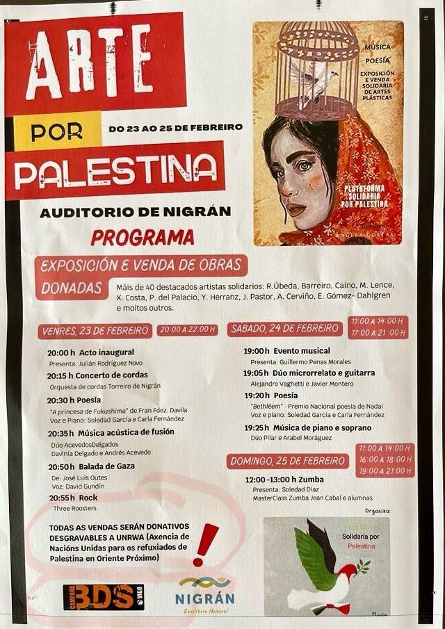 Oleiros no es un caso aislado, denuncia la presidenta de AGAI, pues la localidad de Nigran en Pontevedra también ha convocado “actividades culturales” como un encuentro artístico -convocado por organizaciones pro palestinas, BDS entre ellas- cuyos beneficios serán donados a la UNWRA…